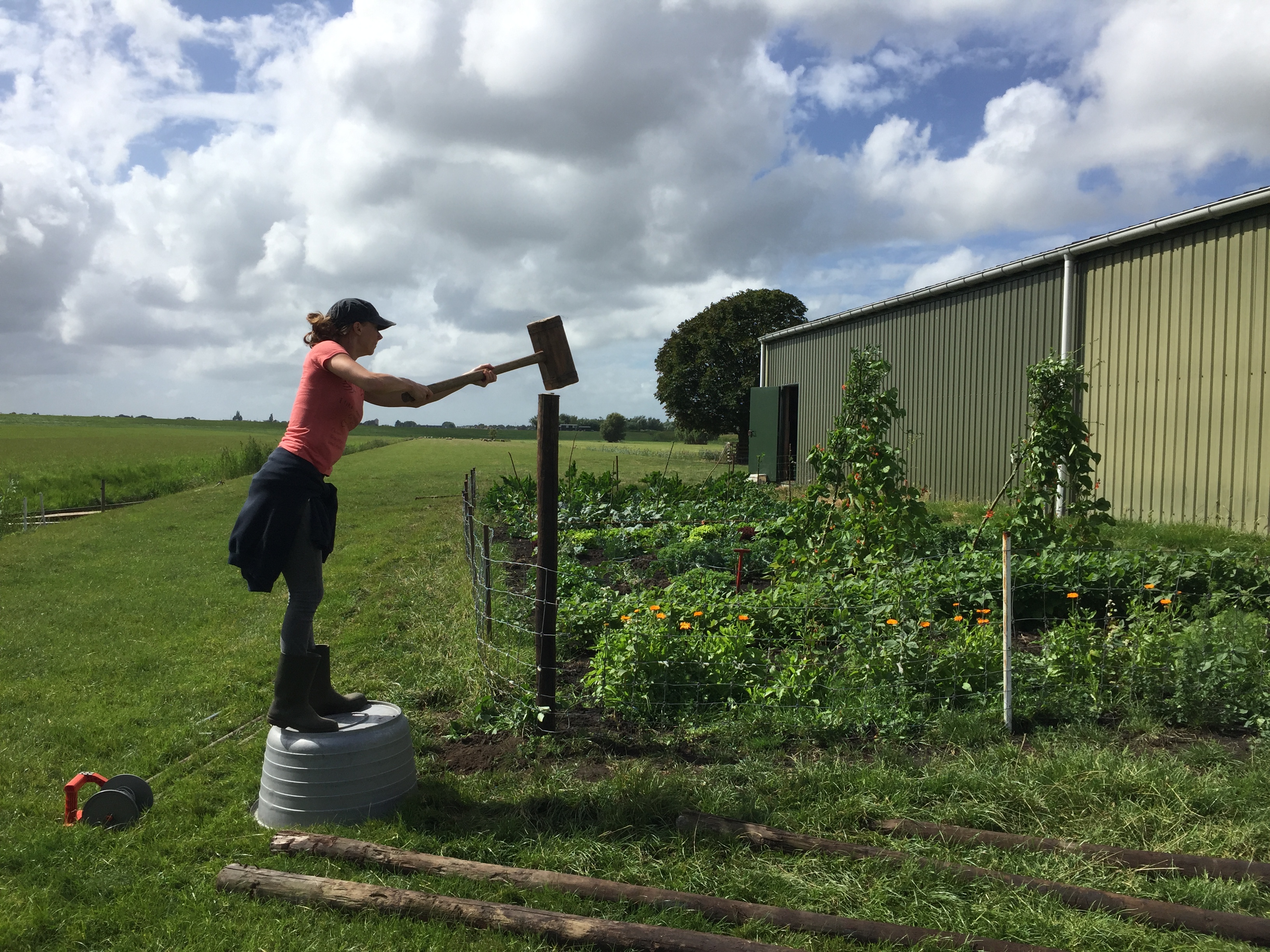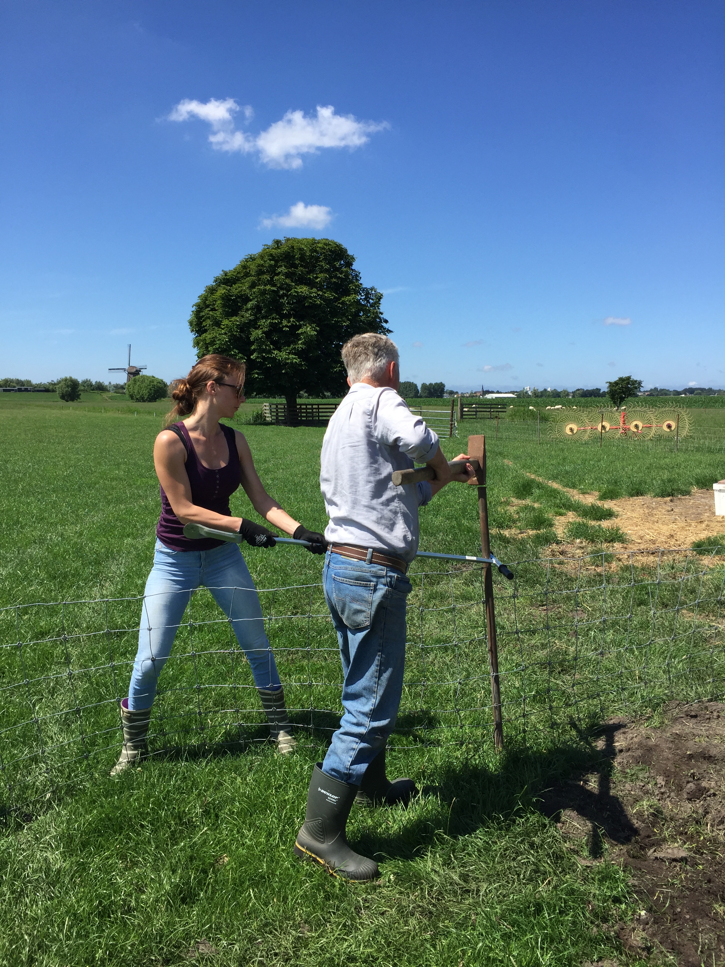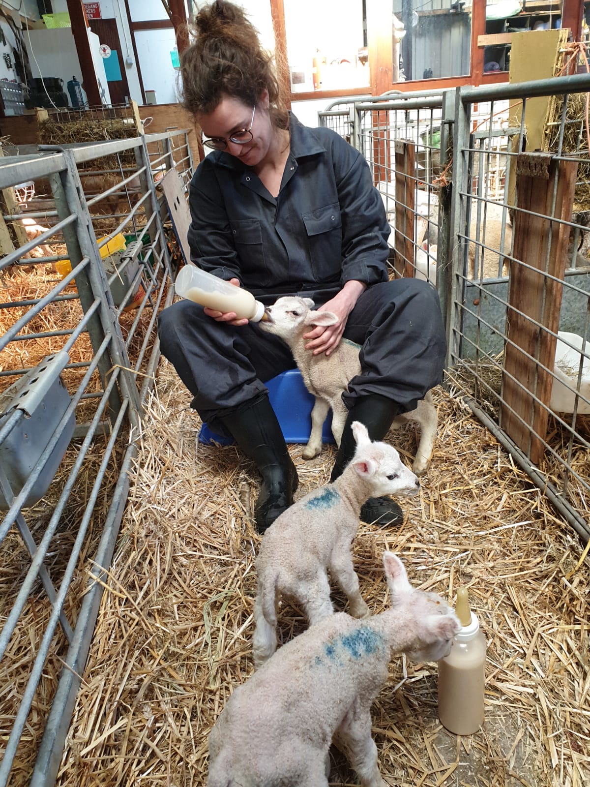 Verzorgen van de dieren. Er zijn 80 schapen (in het voorjaar rond de 200 lammetjes) twee geiten, eenden, konijnen, kippen en een poes.